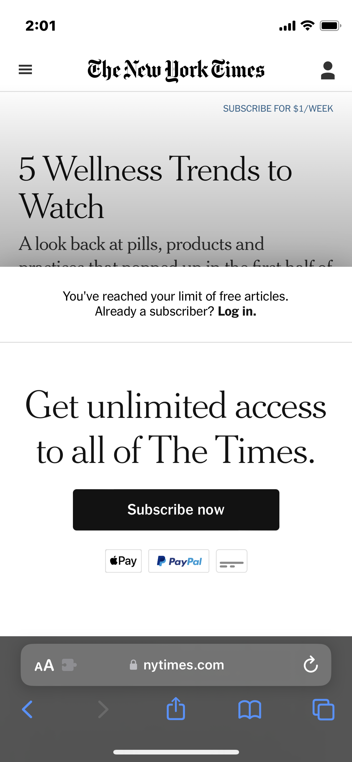 読みたいNYTimes.comの記事に移動します。ペイウォールが表示されても心配いりません。すぐに回避します。